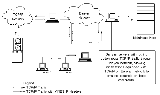Banyan software supports connections through and to TCP/IP networks. The Banyan TCP/IP Server-to-Server option lets you establish internetwork communications over TCP/IP networks. The option works by appending TCP/IP protocol headers onto VINES IP packets and tunneling the VINES traffic through TCP/IP networks. It is especially useful in corporate environments that use TCP/IP backbones to link local and wide area networks.
