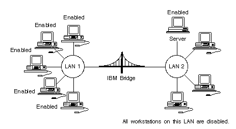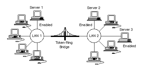 Enabling SLR on just one server on the LAN does not allow the other servers to communicate across the bridge. (These servers might be able to communicate with other servers temporarily, but StreetTalk databases will not propagate.) Figure 4-9 and Figure 4-10 illustrate this rule for enabling SLR on servers. Figure 4-9 shows two LANs connected by an IBM local bridge.