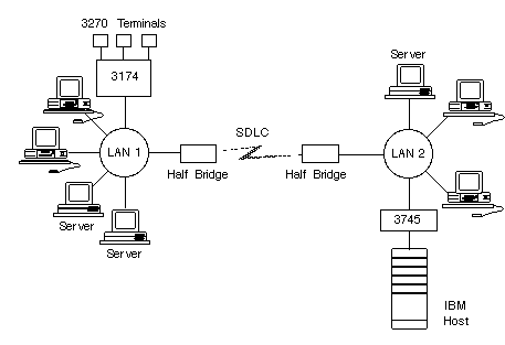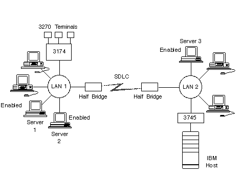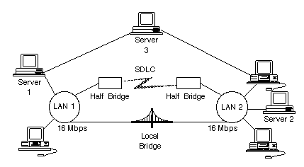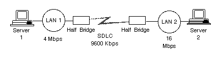 The half bridges (the two members of the pair) use the IBM SDLC protocol to exchange data. SLR is enabled on all the servers on LAN 1 and LAN 2.