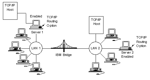 A server can send and receive Token-Ring frames through both local IBM Token-Ring bridges and remote IBM Token-Ring bridge pairs.
