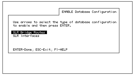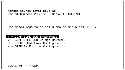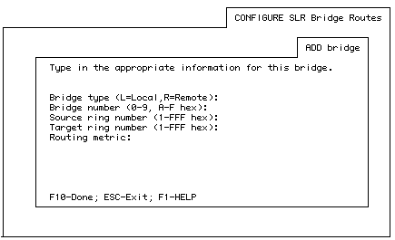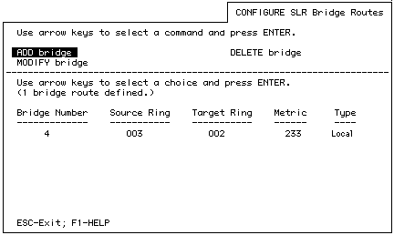 CONFIGURE SLR Bridge Routes - Lets you add a bridge route, delete a bridge route, and modify the current configuration of a bridge route.