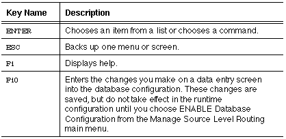 This section describes the standard keys used in the menus and screens for configuring SLR. Table 4-3 lists the keys.