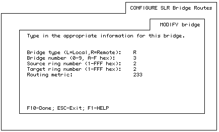 Bridge type (L=Local, R=Remote): - The type of bridge associated with the route. Enter L for a local Token-Ring bridge, or R for a remote Token-Ring bridge pair.