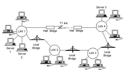 If the T1 link either becomes congested or goes down, Server 1 receives the RTP broadcast packet traversing the three local bridges first. In that case, the route across the three local bridges becomes the route that the Banyan networking software uses to get from Server 1 to Server 3.