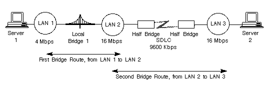 Figure 4-5 shows a simple bridge route. Server 1 and Server 2 are both servers on which SLR has been configured. Both servers are connected to a Token-Ring LAN, which is then connected by a remote bridge to the other LAN. LAN 1 is using a 4 Mbps Token-Ring LAN, and LAN 2 is using a 16 Mbps Token-Ring LAN. The serial link connecting them runs at 9600 bps.