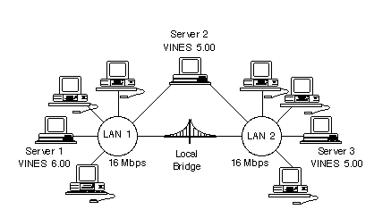In Figure 4-8, traffic going from Server 1, which is running VINES 6.00, to Server 3, which is running VINES 5.00, passes through either Server 2 or through the local bridge depending on how you set the metrics.