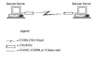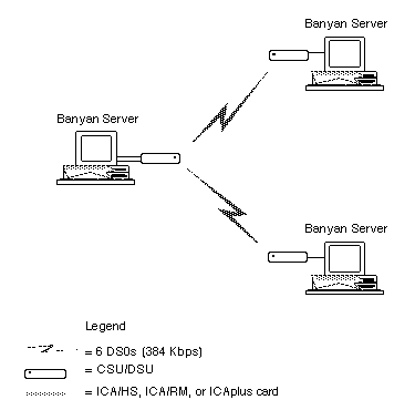 Figure 5-1 shows a Banyan network in which two servers are connected by three 19.2 Kbps DS0 circuits. Each server has a single FT1 line.