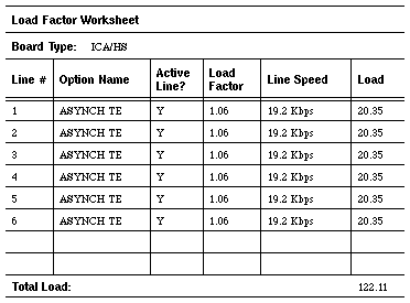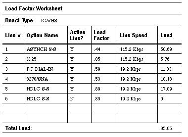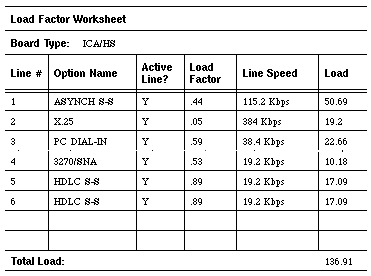 The worksheet sample in Figure 5-6 shows five options distributed over six lines. If the administrator uses the maximum line speed allowed for each port and makes ever line active, the total load on the card is 136.91 percent of the maximum load allowable on the ICA/HS card. This load exceeds maximum capacity.