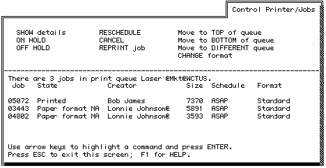 6. When you are finished viewing the job information, press ESC to return to the Control Printer/Jobs menu.