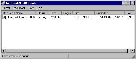 The Windows NT Print Manager displays jobs that originate from both Banyan clients and non-Banyan clients. The print manager identifies jobs that originate from a Banyan client as StreetTalk print jobs (Figure 11-3).