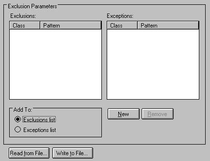 4. Click an Exclusion Type, and then select a class from the Choose A Class drop-down list. Type an Exclusion Pattern, if desired.