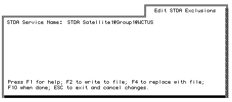 1. Through MSERVICE or OPERATE, at the Configure STDA Service menu, select Edit Exclusions. The Edit STDA Exclusions screen appears.