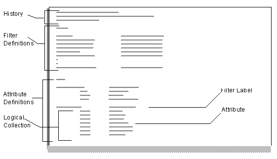 The attribute definition section of AVD files consists of related sets of attributes grouped into collections under descriptive labels. These attribute collections have one or more filter labels.