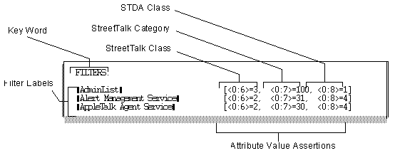 Filter labels always contain three AVAs representing the StreetTalk and STDA classes, and StreetTalk category. The order in which AVAs appear on a line does not matter.