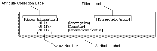 Attributes - All attribute labels and <v:a> pairs in the AVD file are grouped into logical collections in the attribute section. Each logical collection has a label such as "Group Information" or "Mail Addressing" that defines the type of attributes it contains. Filter labels, which identify the collection as appropriate for display with certain classes of StreetTalk resources, appear on the same line in square brackets, for example, ["StreetTalk Group"].