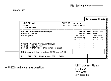 The question in the SETARL screen, "UNIX clients inherit using VINES rules?" asks you to decide whether or not you want new subdirectories and files to inherit access rights following VINES rules or the native file system's rules. In the VINES view, you do not have a choice; VINES rules are assumed. In the Macintosh and UNIX views, however, you can choose between VINES rules or the native file system's rules. Note that only VINES rules can be used by other operating systems. You cannot use UNIX rules on Macintosh folders and files.