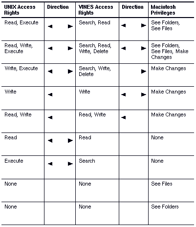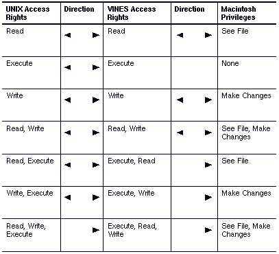 Note that for files, even though VFS defines file-level protection for Macintosh files, the equivalent access rights on the parent folder are required for the access wanted. For example, a Macintosh user would need See Files on the parent folder as well as See Files on the file itself. In contrast, a VINES user would only need Search on the parent directory and Read on the file.