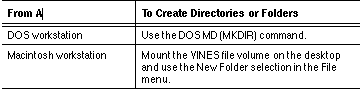 You can create directories from DOS, OS/2, and Windows workstations, or folders from Macintosh workstations that can access the VINES network. When creating directories or folders, use the procedures you would follow in the workstation's native file system. See Table 4-1 for the appropriate procedures.