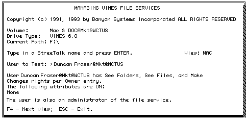 2. Enter a user name to test and press ENTER. The system displays the access rights and attribute information for the current file system view.