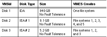 VINES software can create one or multiple file systems on a logical disk up to 16 GB in size. The user specified that VINES software create five file systems on IEA #1 and three file systems on IEA #2. When you create a file service on this server, instead of having a choice of disk1, disk2, or disk3, you have a choice of nine disks, one for each file system on IEAs #1 and 2 and one for the IDA disk. You also see the nine file systems when using the OPERATE program to monitor server resources.
