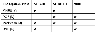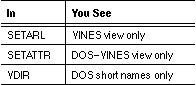 Depending on the types of workstations on your VINES network and on your security needs, you may want to add an environment variable to the profiles of those users who will access the file system programs SETARL, SETATTR, and VDIR. By default, any user accessing the SETARL and SETATTR programs sees both the VINES view (for the DOS and OS/2 FAT file system) and the Macintosh view. By default, any user running the VDIR program sees the DOS short names and the Macintosh long names of directories and files.