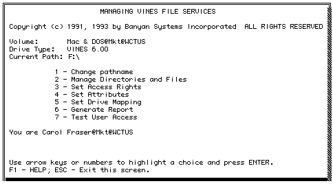 If you choose the Set Drive Mapping, Set Access Rights, Set Attributes, and Generate Report options, use the programs as you usually would. For more information on the SETDRIVE program, see "Using the SETDRIVE Menu" in Chapter 3. For more information on the SETARL, SETATTR, and REPORT programs, see Managing VINES Security.