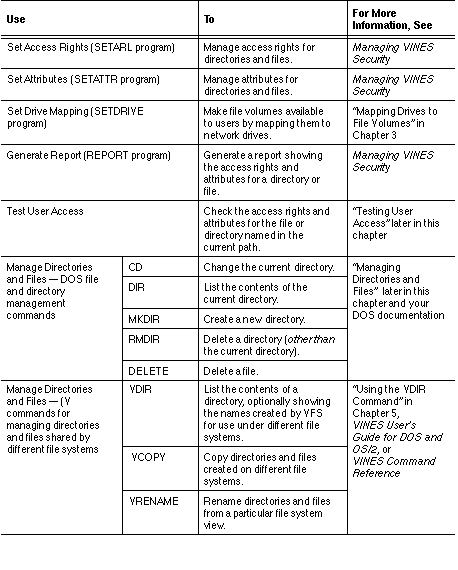 A DOS or OS/2 user's ability to execute a command or access an application depends on the user's access rights to the target file, directory, or volume, and on the attributes of the directory and files. For complete information on access rights and attributes, see Managing VINES Security.