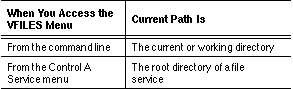 In the SETARL and SETATTR programs, which are accessible from VFILES, you can change the current path. If you change the path while in one of these programs and do not change it back, the new path becomes the current path for VFILES when you return to the VFILES main menu. When you exit VFILES to the command line, you return to the directory that you were in when you entered the VFILES program.