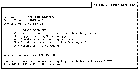 Choose Manage Directories and Files from the VFILES main menu to display the Manage Directories/Files menu. Figure 4-2 shows the Manage Directories/Files menu. From this menu, you can: