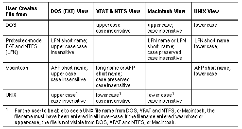 Table A-2 summarizes what happens when a user, working in the file system named in the left column, creates a file. The rules affecting the name assigned to the file under other file systems are shown in the other columns. For example, when a user creates a file from a Windows 95 workstation, the DOS view is an auto-generated alias, or short name and is in all upper case. LFN in the table refers to Windows Protected-mode FAT (VFAT) and Windows NTFS.