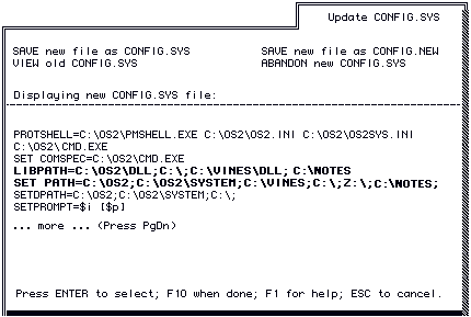 1. From the Update CONFIG.SYS screen (Figure 12-4), enter the appropriate additions. Sample additions appear in bold typeface. Suggested additions are to the LIBPATH and SETPATH statements.