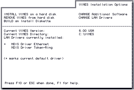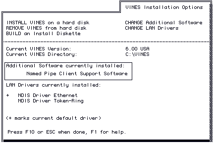 4. Add or remove software according to directions on the screen. When you finish making your changes, press F10. The VINES Installation Options screen appears, which shows your changes.