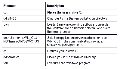 A Banyan Netbios service, DBnames@MIS@WCTUS, is maintained on the same server. To register a computer name with this service, a command file at each workstation runs a command similar to the one that follows: