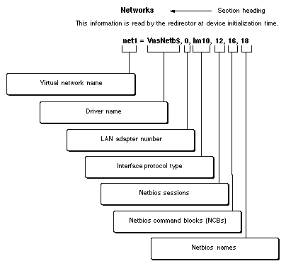 Once the new files are in place, either the LAN Enabler or LAN Requester from IBM must be configured to indicate that an (additional) Netbios adapter is available for use. To configure these programs, modify the IBMLAN.INI file. IBMLAN.INI is usually found in C:\IBMLAN directory. Each Netbios driver is described to the LAN Enabler or the LAN Requester by a statement in the [NETWORKS] section in IBMLAN.INI configuration file. The format of each Netbios network/adapter definition is shown in Figure 14-6.