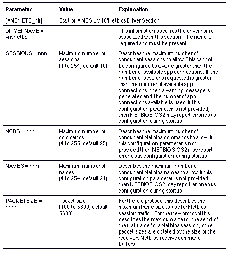 Note: The number of Names, Sessions, and NCBs configured here are allocated from the central pool of resources for the specified adapter in PROTOCOL.INI. This reduces the number of resources reported by NETBIOS.OS2 to the remainder.