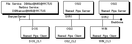 The Named Pipe application clients, DOS_CL1, OS2_CL2, and WIN_CL3