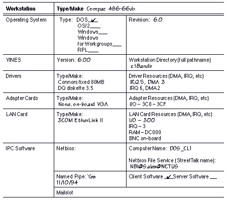 Figure 2-2 shows an example of the Workstation Configuration Worksheet. A master worksheet is included in the VINES Administrator's Worksheets. Make copies of the worksheet for each type of workstation you plan to install. To fill in the worksheet, use the procedure in the section "To Complete the Workstation Configuration Worksheet," which follows.
