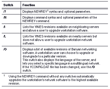 When you change Banyan software revisions on the network, use the NEWREV command to update workstation software to the new revision. If the server from which you normally receive the VINES Files file service is upgraded, you do not have to upgrade your networking software as long as a matching version is found on a neighboring server. If no matching version is found at login, the system runs NEWREV automatically.
