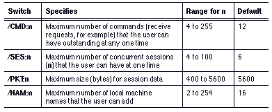 Using PCNETB and the /CMD, /SES, /PKT, and /NAM switches, you can configure the number of Netbios sessions and Netbios commands available at the workstation.