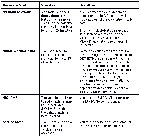The SETNETB command includes a switch that lets you enter no computer name at the time you register with the service. When you do this procedure, the Netbios name registration service assigns the name based on the user's StreetTalk name. It is recommended, however, that you always specify a name in the SETNETB command line.