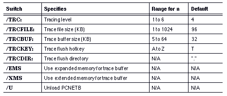 PCNETB [/SES:n] [/CMD:n] [/NAM:n] [/PKT:n] [/TRC:n] [/TRCFILE:n] [/TRCBUF:n] [/TRCDIR:directory] [/TRCKEY:c] [/EMS or /XMS] or [/U]