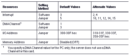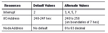 The SMC ARCNET-PS110 Micro Channel card is also supported and uses all the resources that PC/AT cards use. Table A-48 shows the values for the ARCNET card.