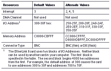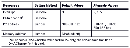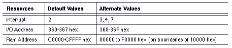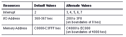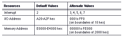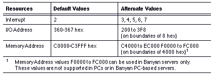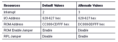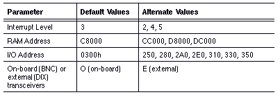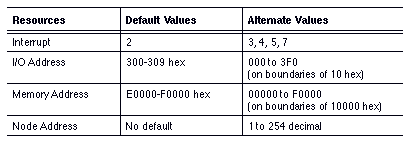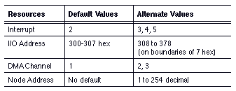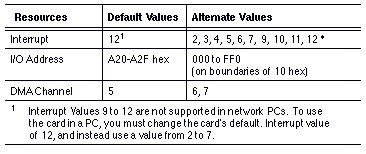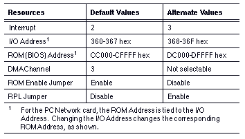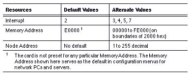 Note that several versions of the StarLAN 10 card exist that are designed for compatibility with various media (for example, twisted pair, fiber optics). Defaults may be different from version to version, depending on the design of the card. For example, some cards do not support an alternate Interrupt value of 5 while others do not support an alternate RAM Address range of A0000 - EC000. The values listed in the PCCONFIG and Add/Change Card software are a superset of values for all cards. For configuration information on these cards, see the manufacturer's documentation.