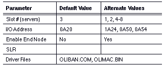 The Olicom Token-Ring cards are also supported on the same type of servers and clients as the Intel TokenExpress cards. Table A-29 shows the values for the TokenExpress and the Olicom Ethernet cards.