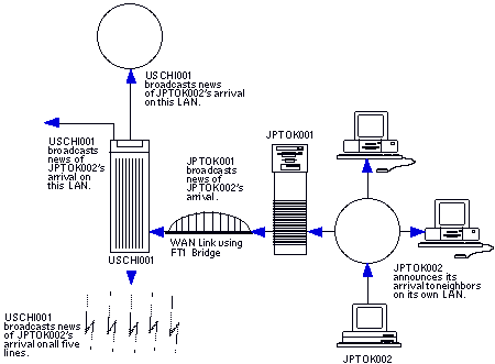 A broadcast packet is sent to multiple destinations. A bit map in the packet determines the number and types (server or workstations) of destinations to which the broadcast packet is sent, as well as the types of media over which it travels.