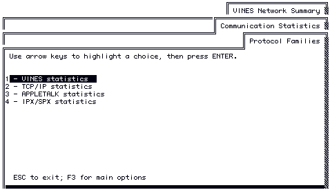 The Protocol Families menu lets you access statistics on all of the available protocol families on the server. This menu always displays VINES statistics. The menu displays TCP/IP statistics, and AppleTalk statistics only if those protocol families are running on the server.
