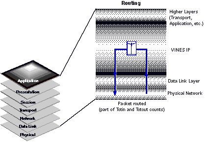 The total number of packets received that were routed to another node. This statistic includes the number of IP packets encapsulated within routed VINES IP headers. If this value is large in relation to Totin and Totout, the server is routing a lot of traffic for other nodes.