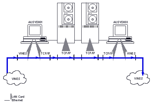 Figure 10-9 shows an example of VINES traffic being tunneled through a TCP/IP network. Figure 10-10 shows AppleTalk traffic being tunneled from a server through a VINES network.