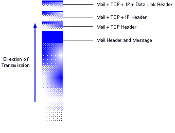 When application programs, such as the VINES SMTP gateway, send data in a TCP/IP network, they deliver the data to the underlying layers. As the data moves downward through each layer, it is encapsulated in that layer's protocol headers for delivery to the appropriate destination. By the time the application data is transmitted on the LAN, it is encapsulated in several headers.