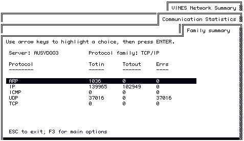 The Protocol Family Summary Menu for TCP/IP displays all of the protocols in the TCP/IP protocol family on which statistics are available and summary statistics for each protocol. Summary and detailed statistics are available for ARP, IP, and ICMP only.